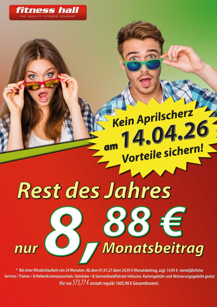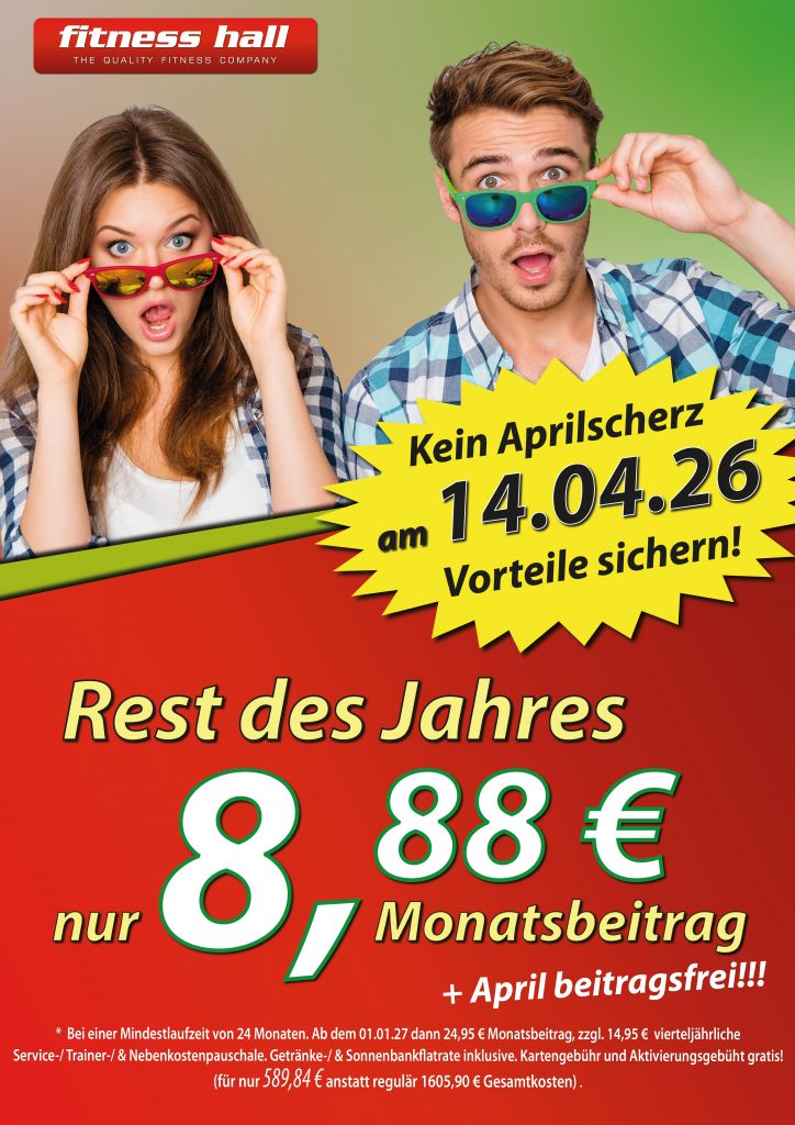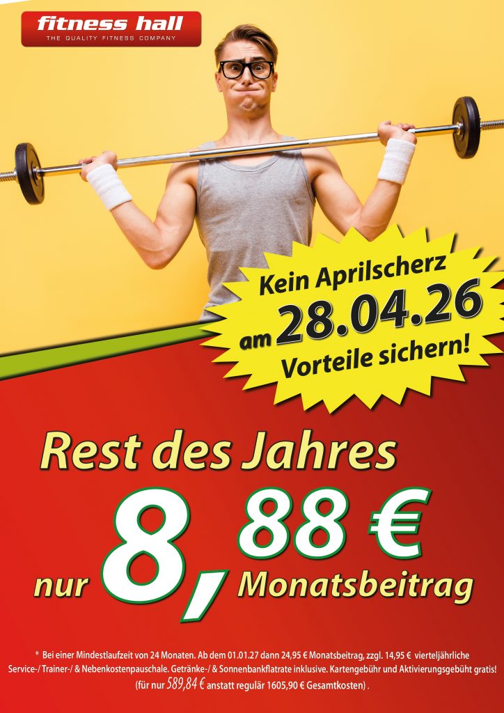🔥 Nur am 14.04. – und das ist wirklich kein Aprilscherz! 🔥 Sichere dir unsere Tagesaktion und trainiere für nur 8,88 € monatlich bis Ende 2026 Warum Fitness Hall? ✨