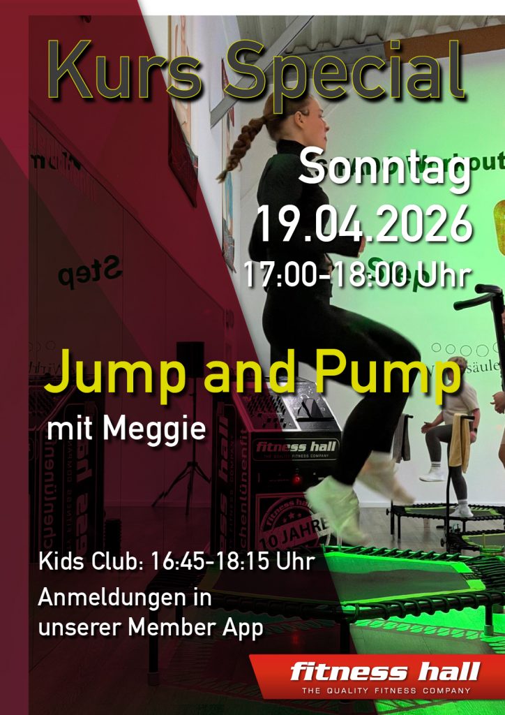 Am Sonntag, den 19.04., ist es wieder soweit: Unser nächstes Kurs-Special steht an! Freu dich auf Jump in Pump mit Meggie – ein Jumping-Fitness-Kurs, der sich bewusst von den regulären