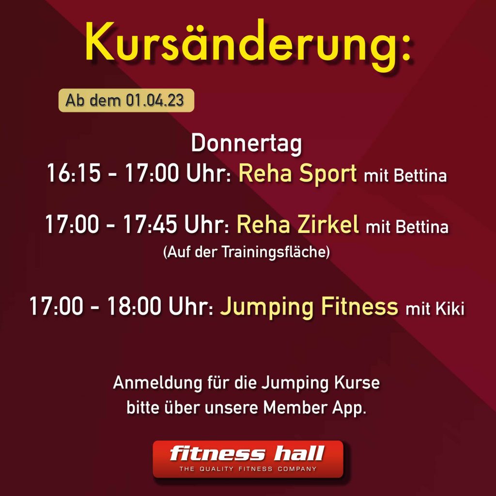 Ab dem 01.04. haben wir kleine Änderungen im Kursplan vorgenommen: Immer donnerstags: 16:15 – 17:00 Uhr Reha Sport (wie gewohnt im Kursraum) 17:00 – 17:45 Uhr Reha Zirkel (auf der Trainingsfläche) und jetzt neu: 17:00 – 18:00 Uhr Jumping Fitness mit Kiki. Anmeldungen für unseren Jumping Kurs wie gewohnt über unsere Member App. Es […]