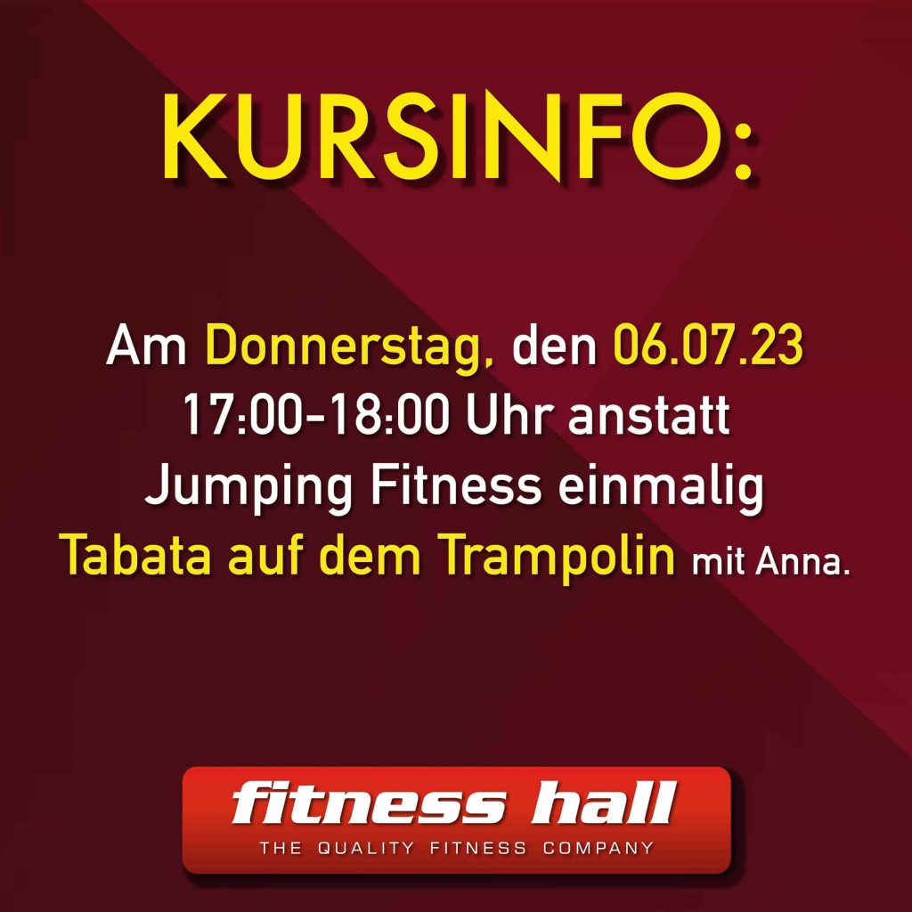 Am 06.07. ab 17:00 Uhr findet einmalig, anstatt Jumping Fitness, einmalig Tabata auf dem Trampolin statt. Wir freuen uns auf dich, dein Fitness Hall Team.