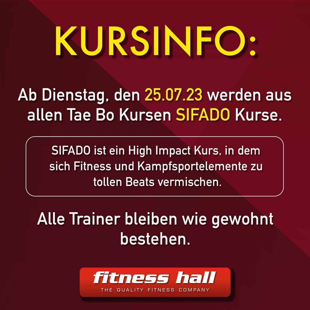 Ab dem 25.07. gibt es eine kleine Änderung in unserem Kursplan. Alle Tae Bo Kurse werden dann zu SIFADO Kursen. Deine Lieblingstrainer bleiben natürlich bestehen. Wir freuen uns auf dich. Dein Fitness Hall Team.