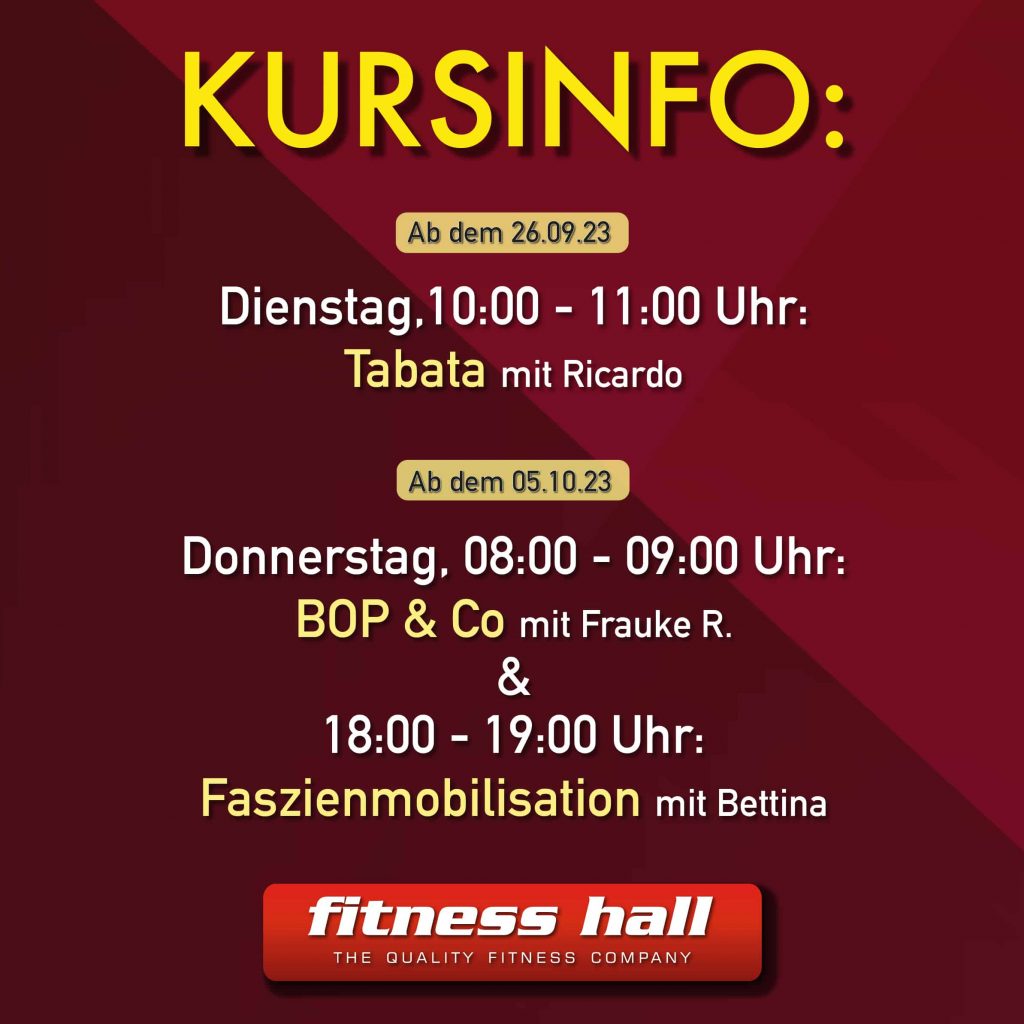 Wir haben jeweils ab dem 26.09. und ab dem 05.10. ein paar Kursänderungen für dich: Dein Fitness Hall Team.