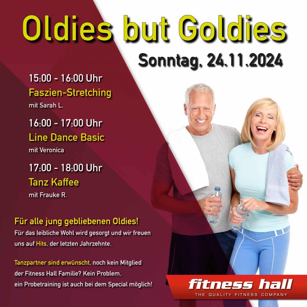 Oldies but Goldies Tag in der Fitness Hall! Am 24.11. feiern wir alle jung gebliebenen Oldies und laden herzlich zu einem unvergesslichen Nachmittag voller Bewegung, Musik und guter Laune ein! Was euch erwartet: 15:00 – 16:00 Uhr: Faszien-Stretching mit Sarah L. 16:00 – 17:00 Uhr: Line Dance Basic mit Veronica 17:00 – 18:00 Uhr: Tanz […]