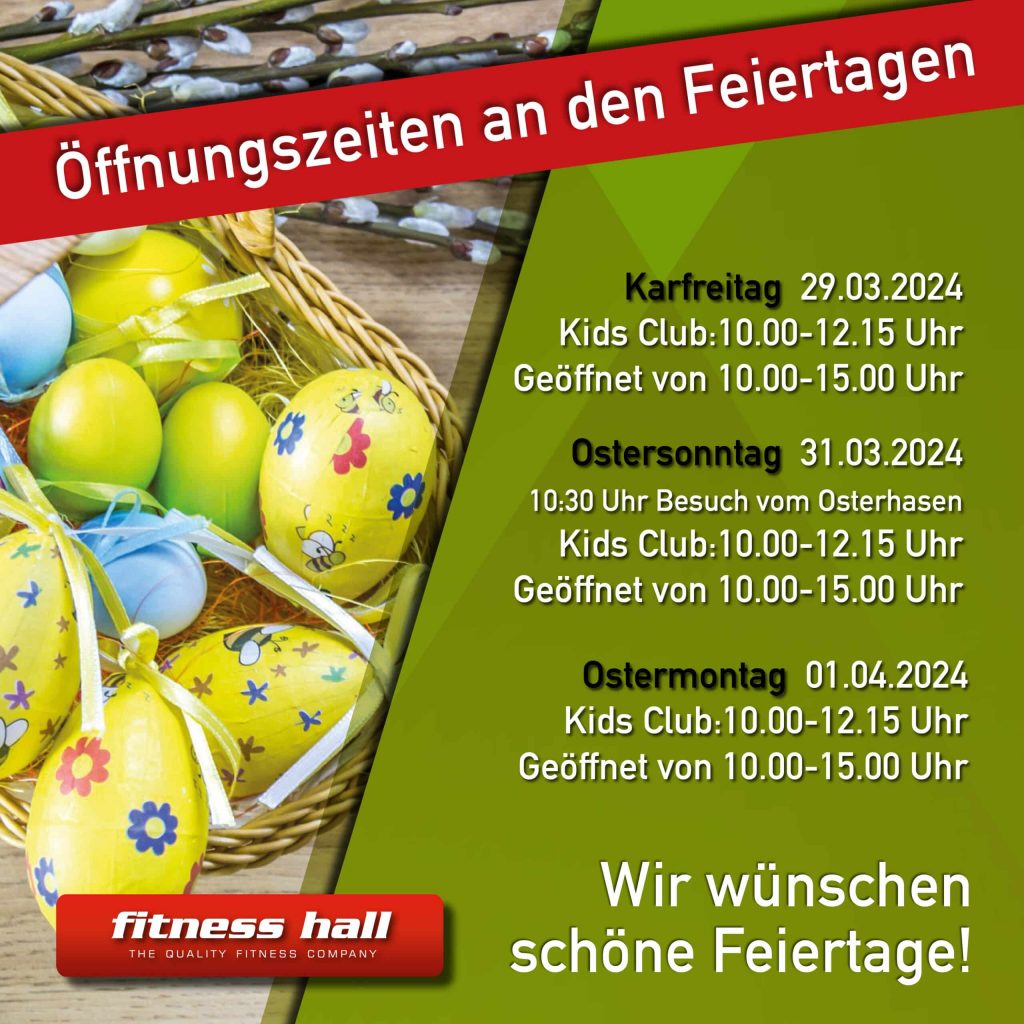 Feiere die Osterfeiertage mit uns in deiner Fitness Hall. Bei uns bleibt keine Ausrede, deinem Training fernzubleiben, denn auch über die Feiertage haben wir für dich geöffnet. Verbringe deine freien Tage aktiv und starte in den Frühling mit Energie und Motivation. Unser Team steht bereit, um dich bei deinen Fitnesszielen zu unterstützen.